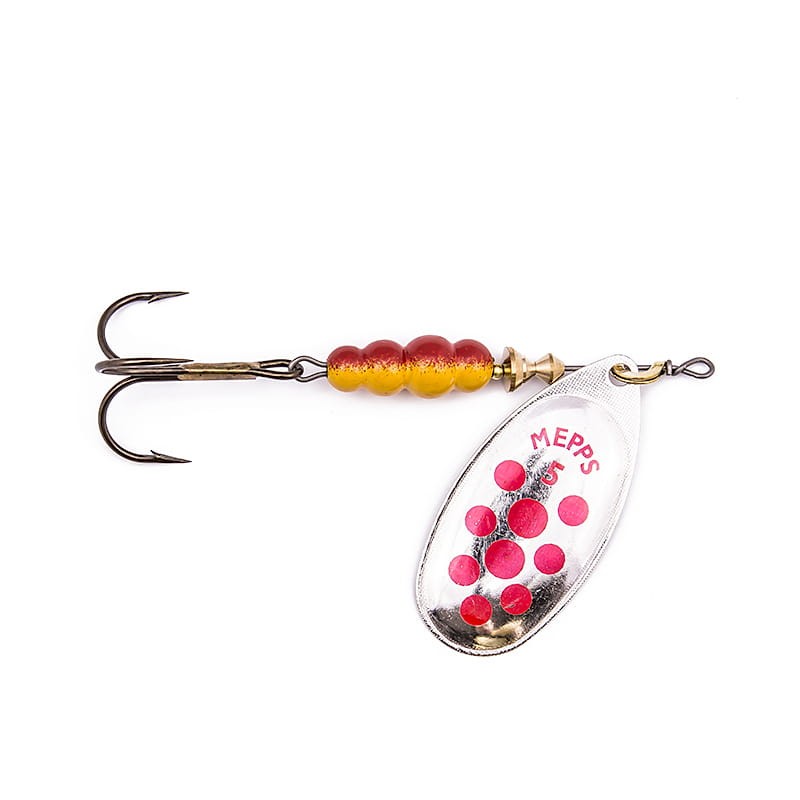 AGLIA DECOREES kolejny klasyk MEPPS-a, tylko pozornie czerwone i czarne kropki na standardowych paletkach typu Aglia to taki sobie bezładny ozdobnik. Tymczasem podczas wirowania tworzy się w wodzie paskowana smuga o zależnych od prędkości obrotów przejściach tonalnych, gradientach znakomicie uatrakcyjniająca łowność błystek.