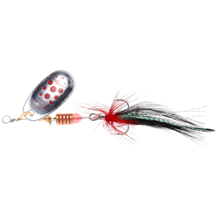 Błystka typu Blaster uzbrojona w dodatkowy chwost okalający kotwiczkę, dzięki dodatkowemu elementowi wabiącemu zwiększa się skuteczność przynęty, szczególnie przy połowie okoni oraz pstrągów.