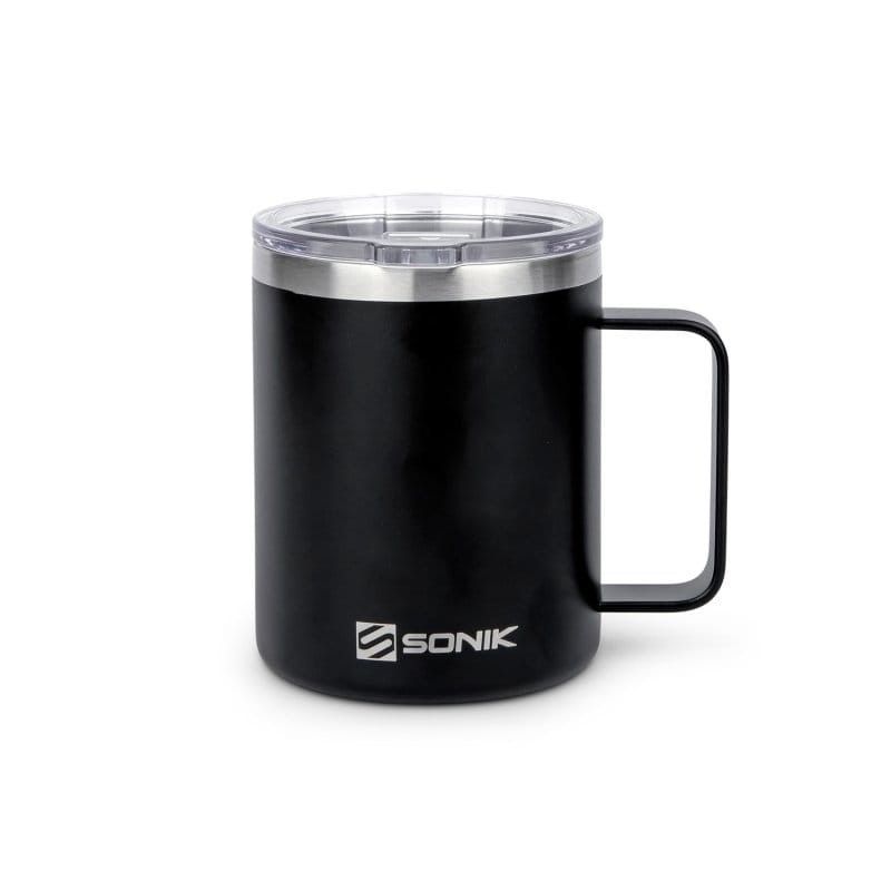 Czarny, matowy kubek termiczny z klasycznym logo Sonik na spodzie.