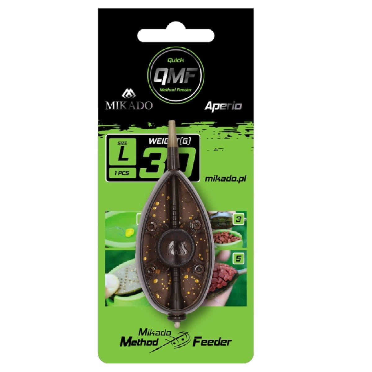 System szybkiej wymiany koszyka, bez potrzeby przewiązywania zestawu. Wystaczy zdjąć gumową tulejkę, zsunąć koszyk z trzpienia i zamienić go innym modelem. Stożkowy, żebrowany trzpień, zapewniający stabilne mocowanie. Zestaw dodatkowo został wyposażony w łącznik do szybkiej wymiany przyponów. Wszystkie te elementy połączone z koszyczkiem Aperio, tworzą najnowszy system Q.M.F. – Quick Method Feeder.