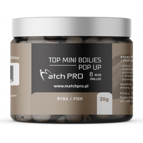 Seria najwyższej jakości przynęt w rozmiarze 8 mm. Długie i intensywne testy tych przynęt pozwoliły dopracować ich skład i właściwości tak aby były bardzo skuteczne w każdych warunkach. To co wyróżnia Matchpro Top Boiles to idealna miękkość, dzięki której ryby pewnie ją pobierają. Wyjątkowa lekkość kulki zapewnia bardzo naturalne zachowanie się w wodzie co niezwykle podnosi skuteczność łowienia. Top Matchpro Bolies są bardzo aromatyczne, oddając przez długi czas równomiernie aromat w wodzie co przekłada się na dużą ilość brań. Dodatkowo kulki posiadają otwór dzięki któremu bardzo łatwo i szybko można założyć przynętę. Różnorodność smaków i kolorów pozwala dopasować się każdemu wędkarzowi do aktualnych warunków panujących na łowisku.