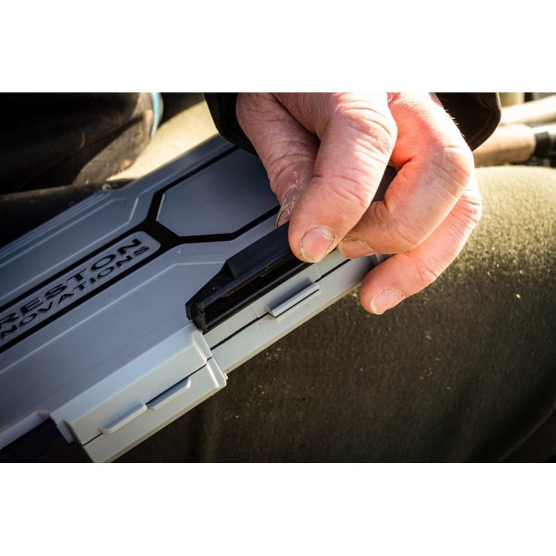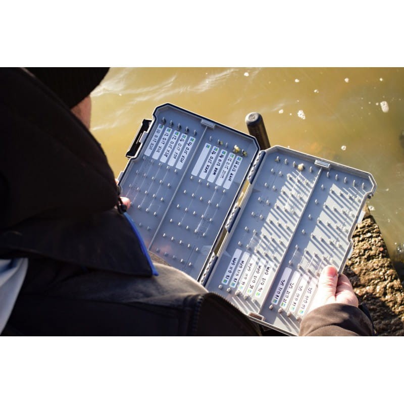 Wszechstronne pudełko na przypony idealne do przechowywania dużych ilości przyponów o długości od 3 ”(75 mm) do 9” (225 mm). Pojemność pudełka jest ogromna. Wyposażone w długie blokady, które pomieszczą do 20 haczyków na jednej blokadzie. Istnieje 20 dostępnych opcji dla dłuższych haczyków do rozmiaru 9 ”i 40 pozycji, jeśli haczyki mają długość 3 lub 4”, co oznacza, że można nałożyć w sumie do 800 haczyków o długości 3 lub 4 ”. Uszczelka zapobiega przedostawaniu się wody do wnętrza organizera. Pudełko uszczelnione dwoma klipsami oraz dodatkowymi magnesami po bokach. Pudełko jest zbudowane z ultra wytrzymałego tworzywa ABS i ma przymocowane blokady, które są idealnie ustawione zapobiegając skręcaniu przyponów. Każdy rodzaj przyponu może być wyraźnie oznaczony na dołączonych etykietach. Portfel na przypony o długości od 3" (7,5cm) do 9" (22.5cm) Wymiary (cm): 27 x 20 x 3
