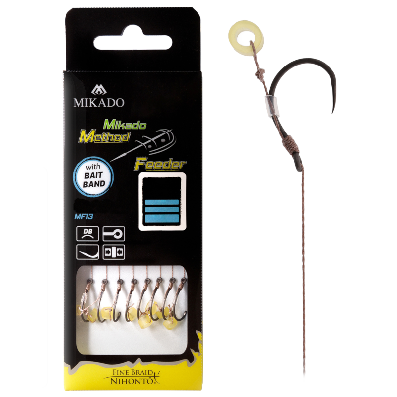 Bezzadziorowe haki MF13 zawiązane na przyponach do techniki Method Feeder. Często wymagane na łowiskach komercyjnych. Wykończone najwyższej klasy plecionką, gumką do montażu przynęty oraz piekielnie ostrym, bezzadziorowym hakiem MF13.