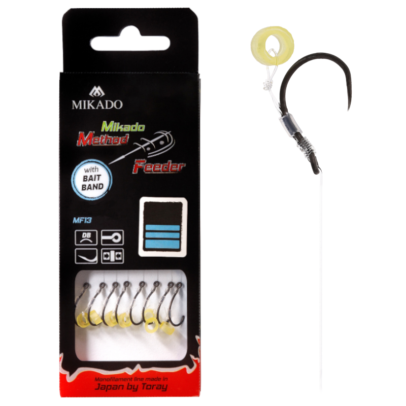 Bezzadziorowe haki MF13 zawiązane na przyponach do techniki Method Feeder. Często wymagane na łowiskach komercyjnych. Wykończone najwyższej klasy żyłką, gumką do montażu przynęty oraz piekielnie ostrym, bezzadziorowym hakiem MF13.