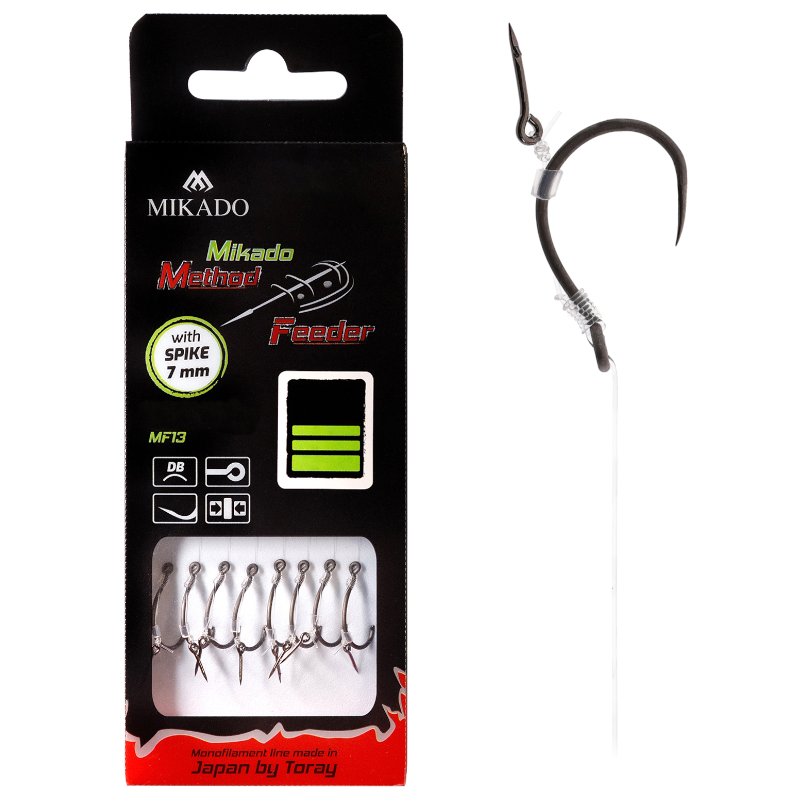 Bezzadziorowe haki MF13 zawiązane na przyponach do techniki Method Feeder. Często wymagane na łowiskach komercyjnych. Wykończone najwyższej klasy żyłką, gumką do montażu przynęty oraz piekielnie ostrym, bezzadziorowym hakiem MF13.