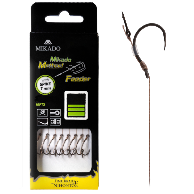 Bezzadziorowe haki MF13 zawiązane na przyponach do techniki Method Feeder. Często wymagane na łowiskach komercyjnych. Wykończone najwyższej klasy plecionką, igłą do montażu przynęty oraz piekielnie ostrym, bezzadziorowym hakiem MF13.