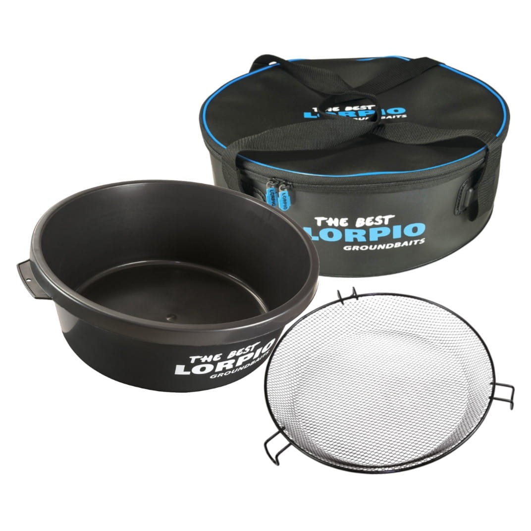 Zestaw do przygotowania zanęt, składający się z 18-litrowej torby (miski) z deklem i 11-litrowej miski z sitem (oczko Ø 4 mm).
